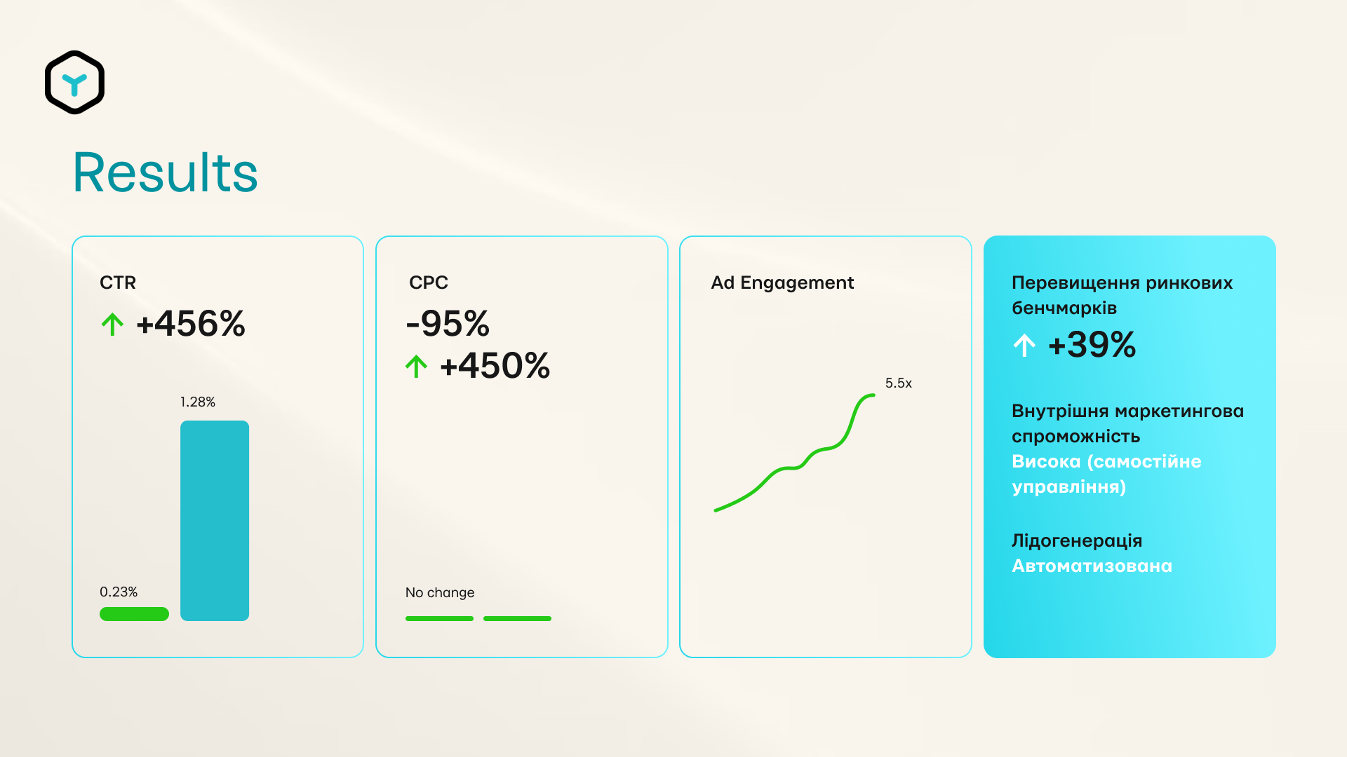 Результати були очевидними: CTR зріс з 0,23 % до 1,28 % — це більш ніж п’ятикратне збільшення. Водночас CPC знизилася на 95 %.